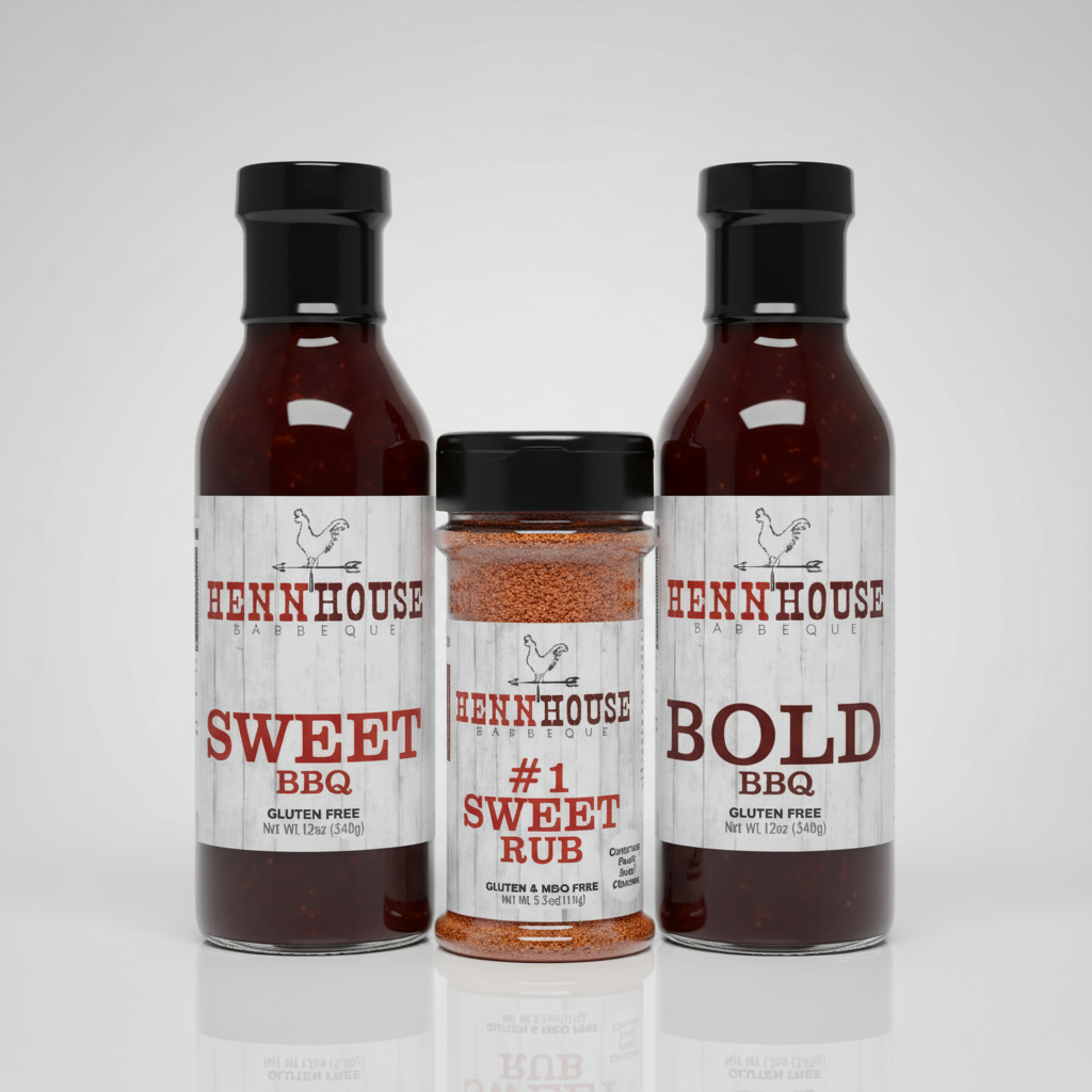 Get your fix of BBQ flavor with a trio of Henn House’s famous BBQ sauces and rub! You’ll get our Sweet BBQ Sauce, Bold BBQ Sauce, and our #1 Sweet Rub together in one awesome bundle, at an unbeatable price!